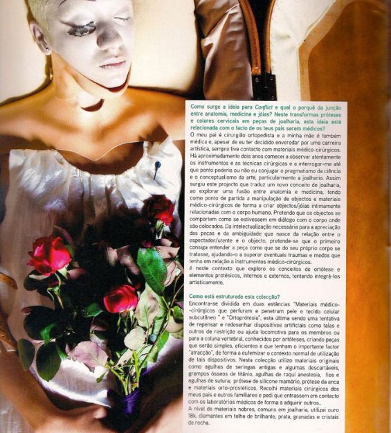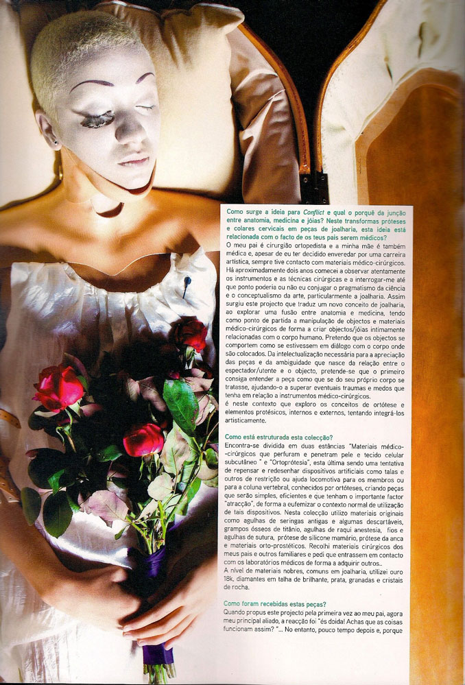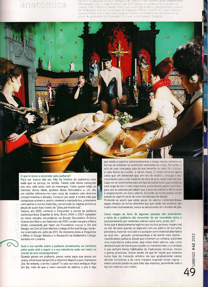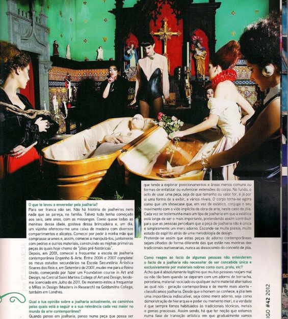 Decorria o ano de 2012 quando fui convidada a produzir um dos primeiros shootings da Olga Noronha, a joalheira cirurgiã, que usa materiais médico-cirúrgicos e orto-prostéticos como peças de joalharia, incrivelmente adaptados ao corpo humano. A Olga rompeu completamente a joalharia dita normal e para mim esse foi o maior desafio. O conceito era bizarro, iria fotografar um funeral, dentro de uma capela todo o conceito em termos de styling tinha que ser excêntrico, extravagante, invulgar tal como as suas peças. Tivemos como modelos modelos, pessoas ditas reais e a atriz Ana Morina a interpretarem os seus papeis neste trabalho tão diferente e único.